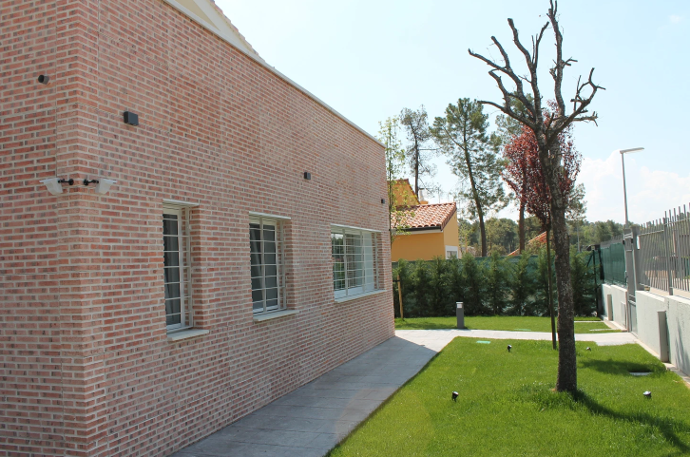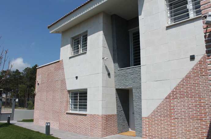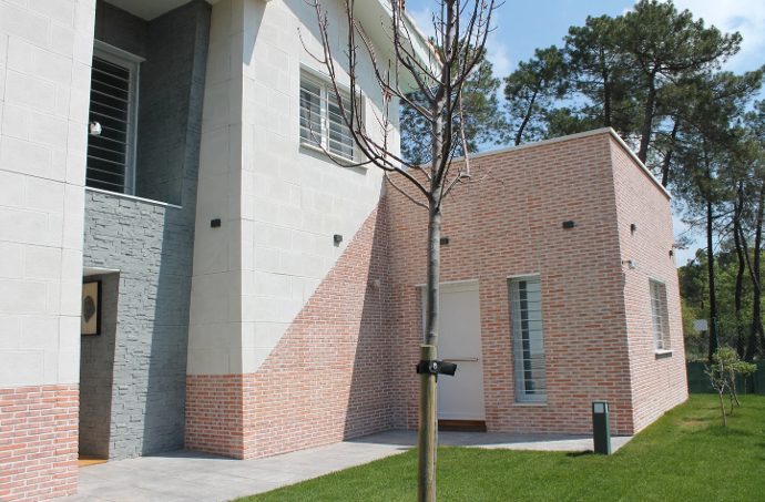 - Fachada ventilada combinando paneles de hormigón imitación piedra caliza (bordes abujardados) con paneles de imitación ladrillo caravista galletero