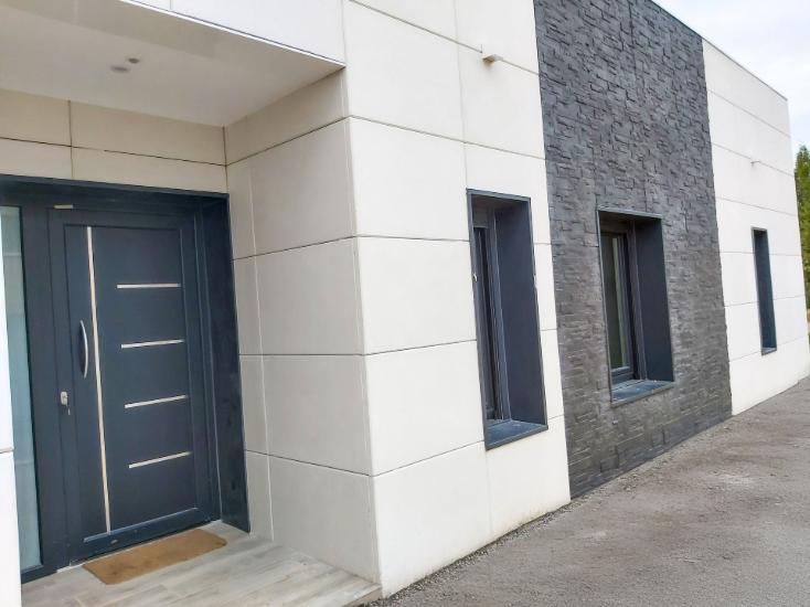 - Fachada ventilada: Paneles de hormigón prefabricado con acabado en piedra blanca y detalles en pizarra verde.